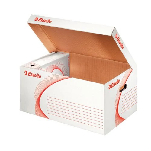 A kiváló minőségű Esselte Standard dobozok már több mint 25éve állnak a használók szolgálatában. Az Esselte dobozokban és konténerekben évente több millió dokumentumot archiválnak le a közintézmények és magánvállalatok egyaránt. Ideális archiváló dobozok tárolására, de emellett univerzális tároló- és szállítódobozként is használható. Felfelé és előre nyíló tetővel 6 db 80 mm vagy 5 db 100mm széles doboz archiválásához. Könnyen összeállítható, összeállítási útmutató a dobozokon. Nagy teherbírás a megerősített oldalfalaknak és talpnak köszönhetően. 100%-ban újrahasznosított és 100%-ban újrahasznosítható karton alapanyag, FSC minősített. A konténereket üresen szállítjuk.