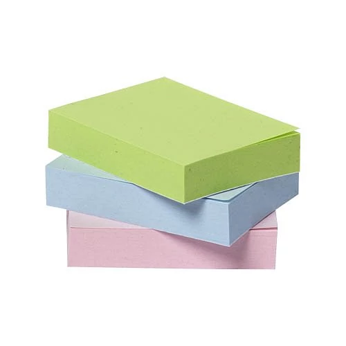 Öntapadós pasztell színű jegyzettömbök újrahasznosított papírból. A műanyagmentes dobozban 3 különböző színű jegyzettömb található : rózsaszín,kék,zöld. 4x3x100 lap, méret 38x51mm.